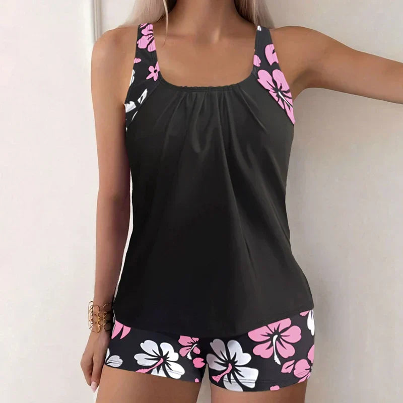 Das gemusterte Oberteil mit schmalen Trägern formt Ihr Dekolleté, während die bequemen Boyshorts sanft Ihre Hüften umschmeicheln – perfekt zum Bewegen, Schwimmen & Entspannen.